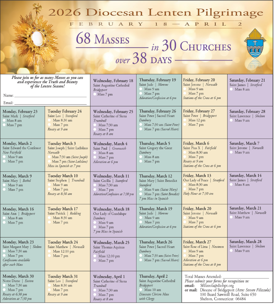 The 2026 Lenten Pilgrimage Schedule has been announced! Masses will take place between February 18 and April 2 across 30 Churches throughout the Diocese. Please join us and experience the Truth and Beauty of the Lenten Season!